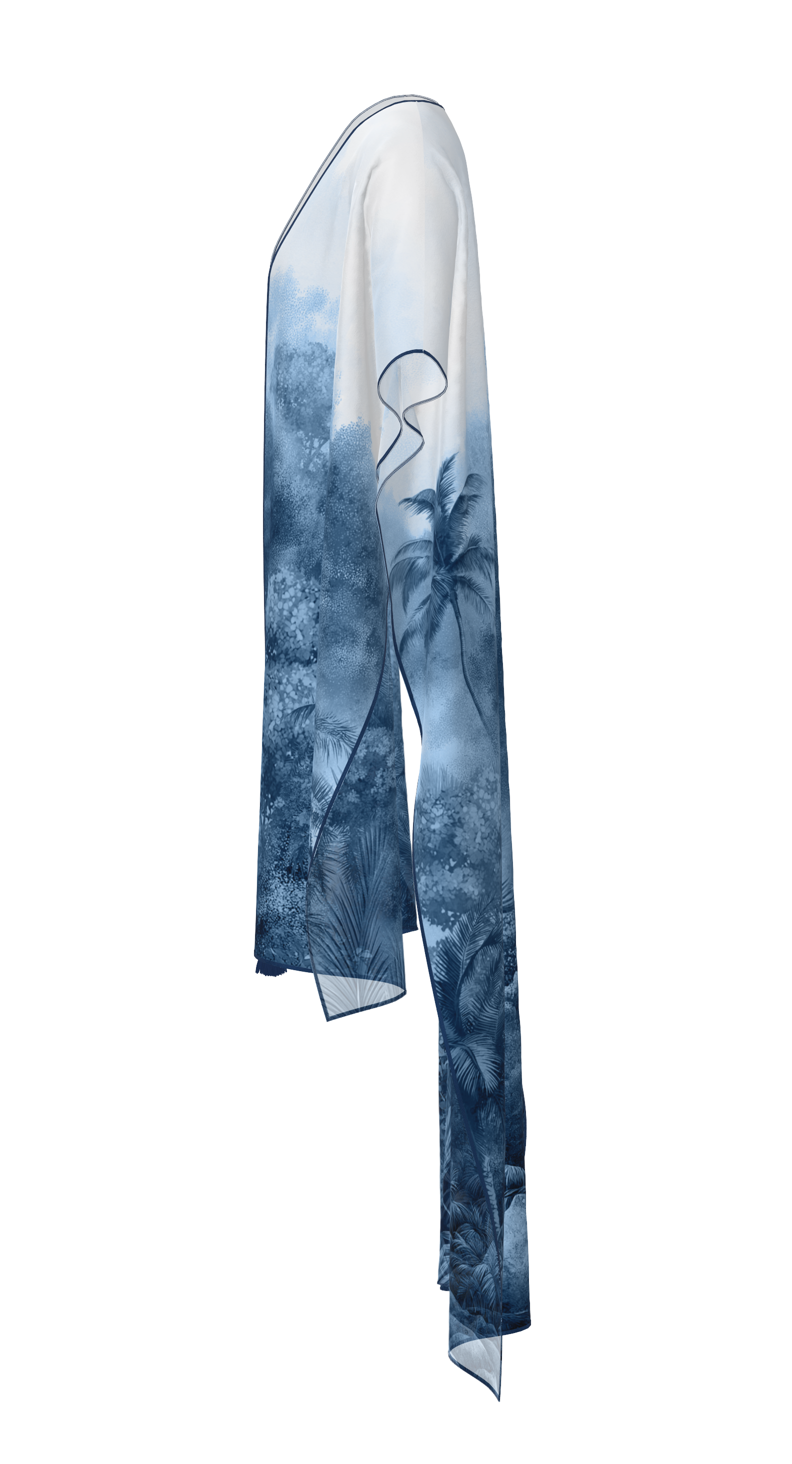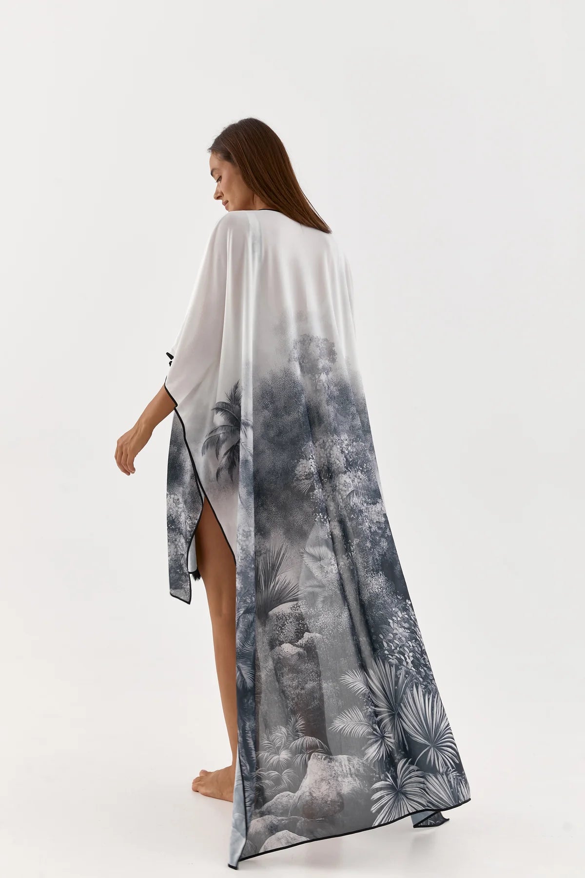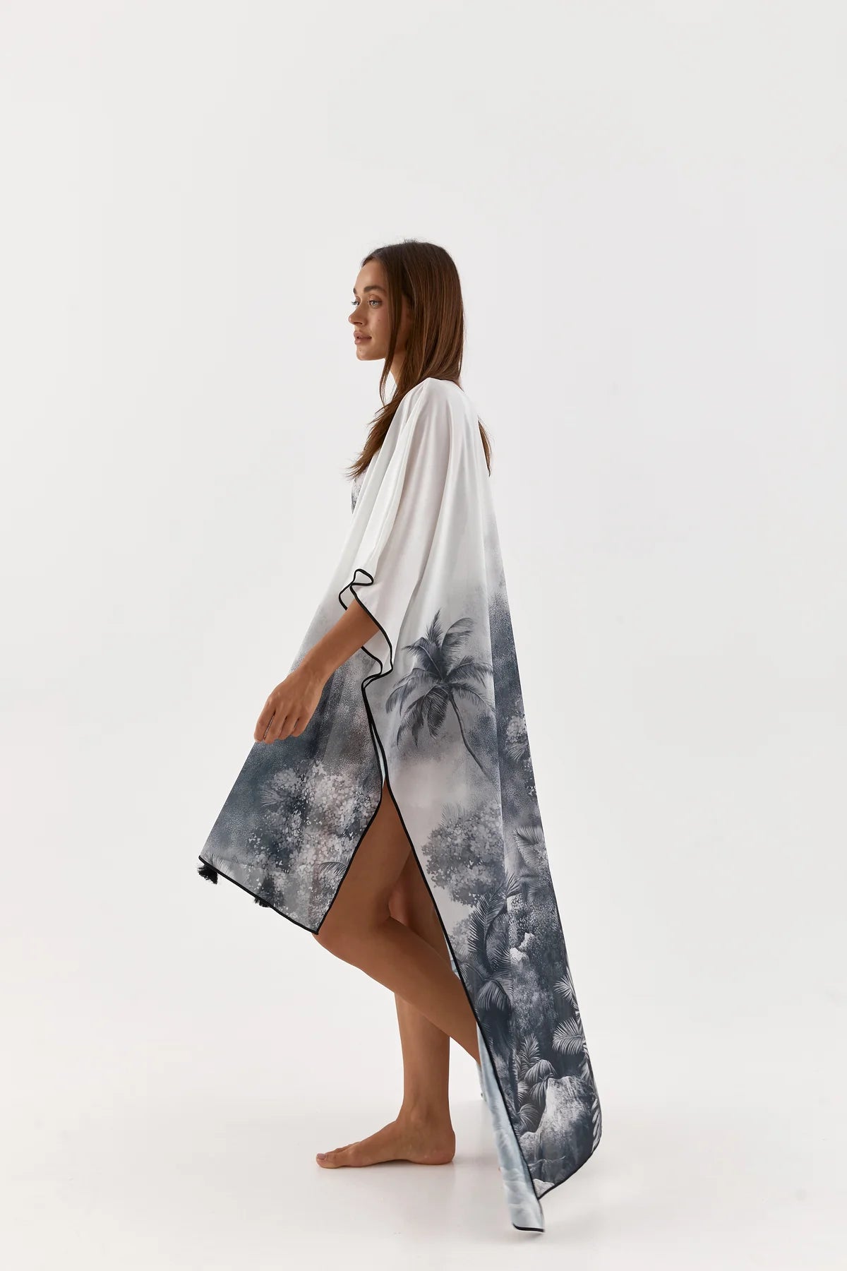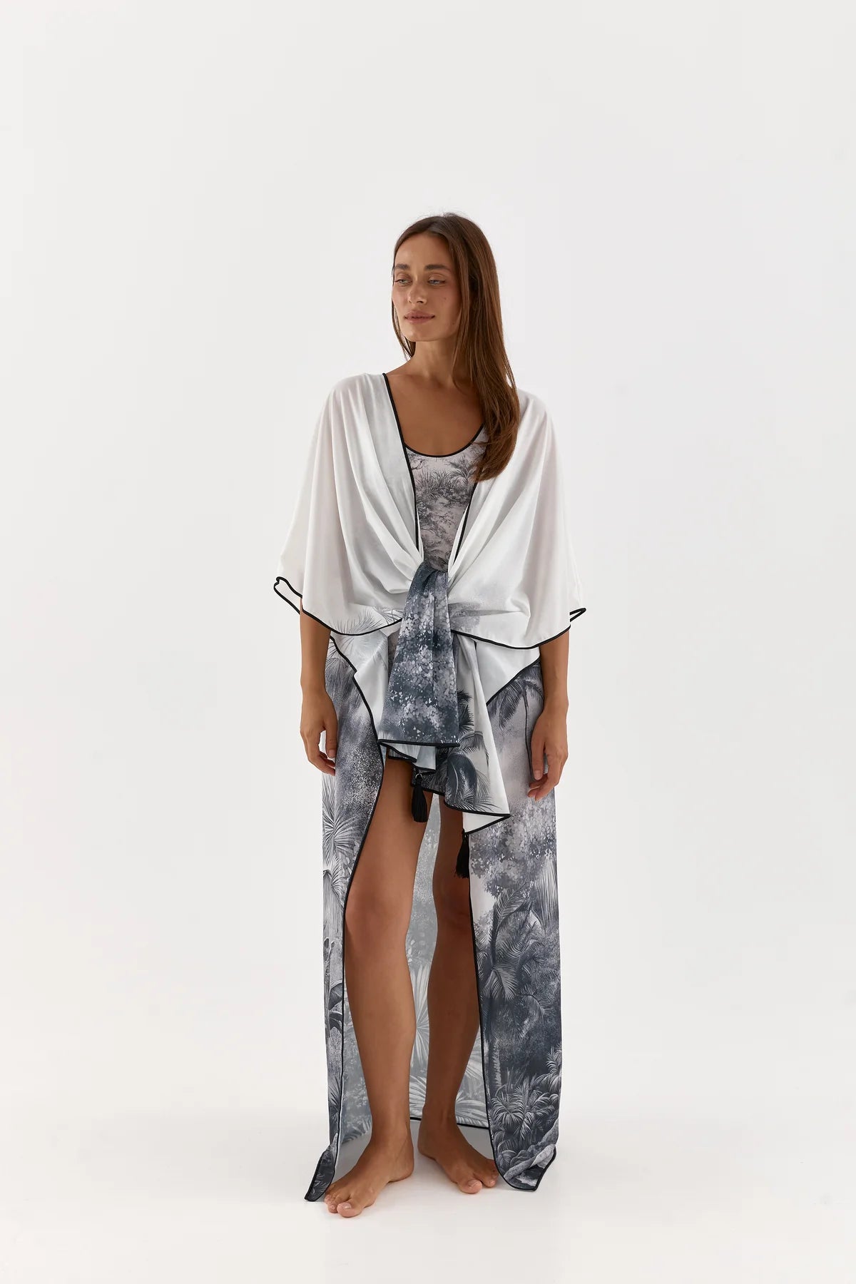 Taha is a poncho-style cape made from the same fabric as the swimsuit. It drapes easily over the body, gently covering the shoulders and back, giving a feeling of weightlessness. It is convenient to throw on after swimming or take with you on a walk by the water.